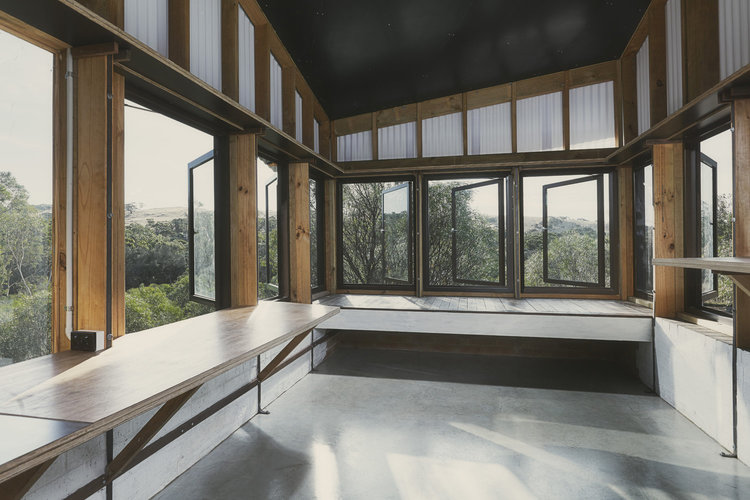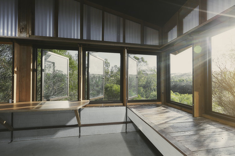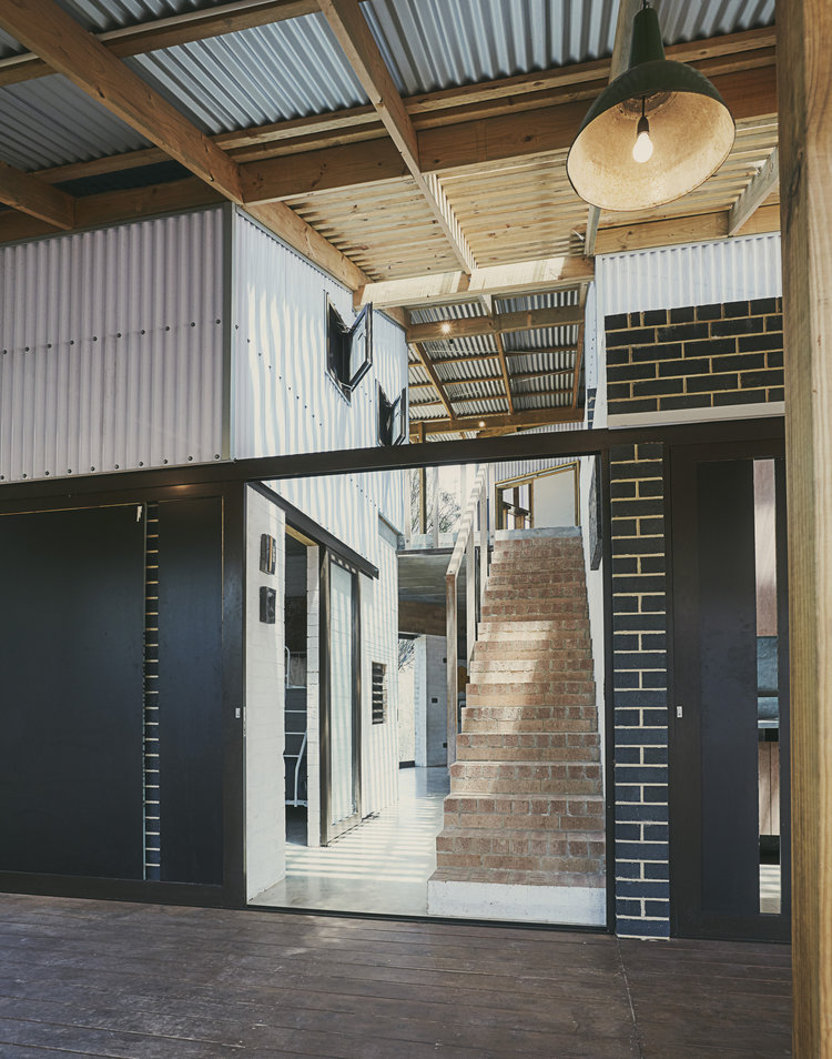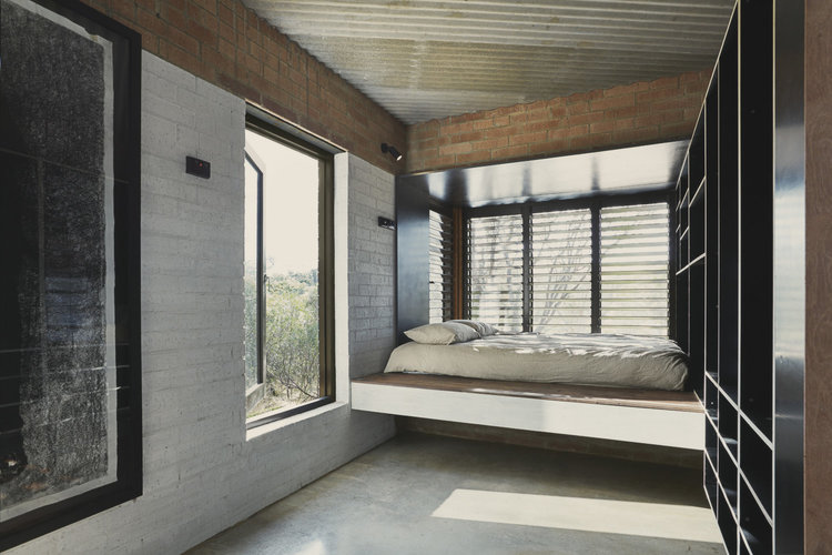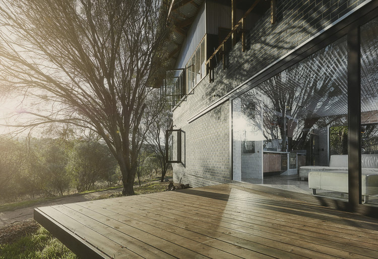 The Toodyay Shack sits on a re-viewed and re-configured 1/2 acre town site. The memory of the house is also re-viewed and re-configured. The climatic regression house plays with thresholds of what is internal and what is external. Sailing a boat and going camping metaphors are completely accurate in the way the house is activated and used depending the weather. The actualization of this manipulation that includes orientating house to climate is a brick cave with a timber fly roof.