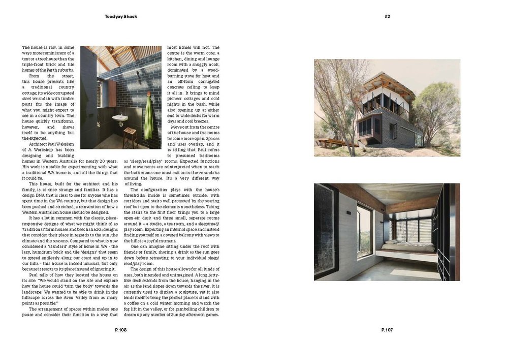 Issue #2 is a 128 page, 205 x 275mm locally printed publication with two limited run gloss laminate covers and 112 uncoated and 12 gloss internal pages. Issue #2 Cover A features The Toodyay Shack by Paul Wakelam. Cover – Luke Carter Wilton