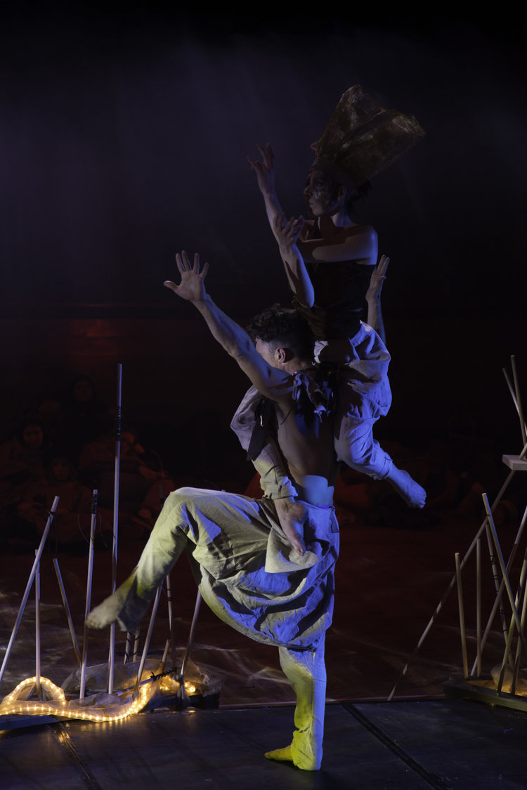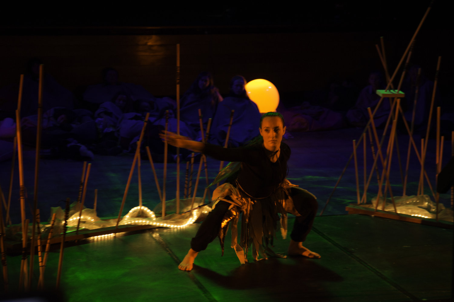 The audience is as important to the piece as the dancers. Audience members move in and out at their own will throughout the night, attending the nesting dancer as if keeping vigil through a storm. They can choose to come at any time during the night, and stay for as long as they choose.